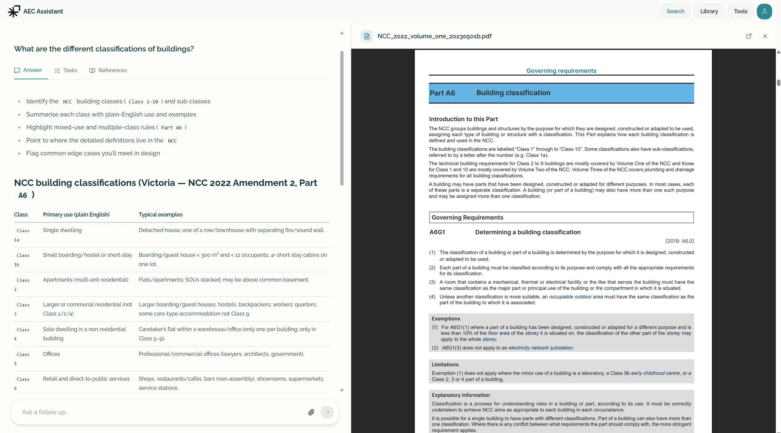 You can cross-reference the original NCC or Australian Standard text alongside the Assistant’s explanation — perfect for verification and learning.